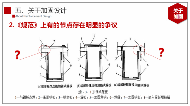 我們要從設計理念上來考量,不是照搬照抄就行了,要注意使用的先決條件,例如,必須混凝土不產(chǎn)生脆性破壞,必須沒有震動的條件下去使用等先決條件。但很多設計師忽略了這些節(jié)點的問題,像這個螺母箍上的叫做包鋼,如果混凝土的強度是C10、C15就破壞,形成不了完整的骨架,這是規(guī)范上的問題。