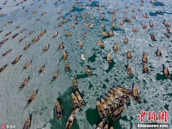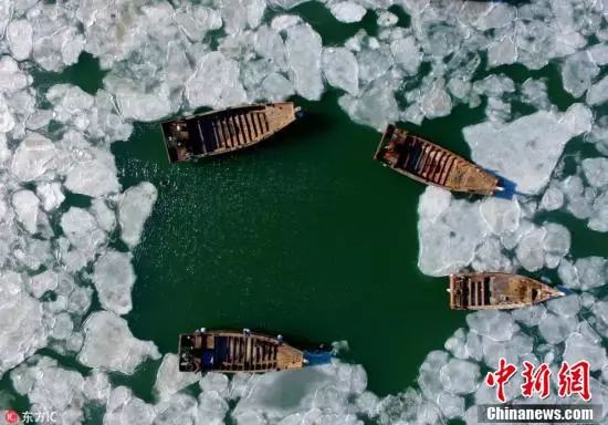 遼東灣超四成海面遭遇冰封 大批漁船被凍海面