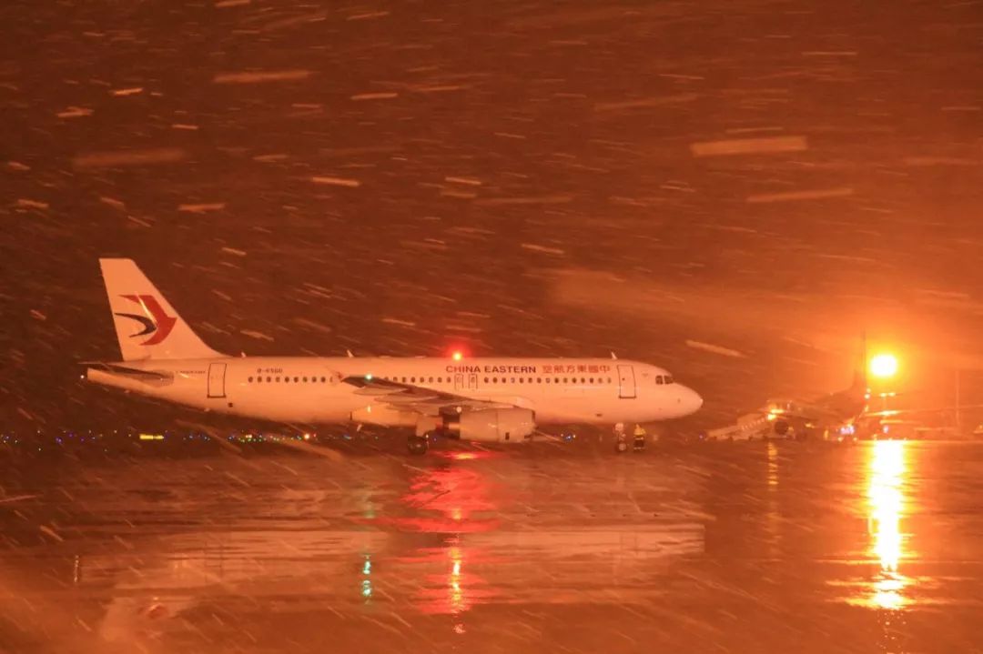 昨晚10點之后,浦東機場雪量明顯加大,圖為東航機務人員完成飛機除防冰工作后,飛機順利出港。