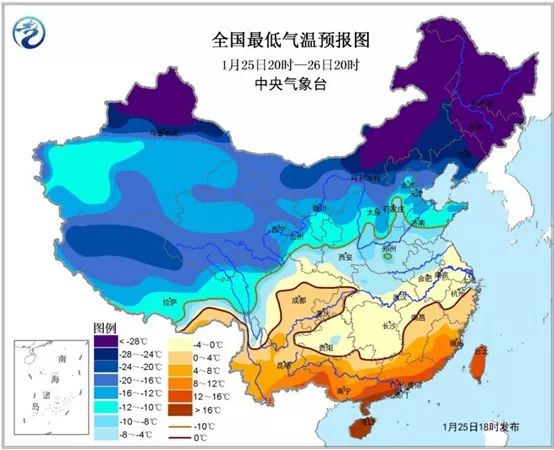 中央氣象臺1月25日18時繼續發布寒潮藍色預警。25日至26日,我國中東部部分地區仍有4~5級偏北風,西南地區東南部、華南西部和北部等地氣溫下降6~8℃,部分地區降溫幅度可達10~12℃;期間,最低氣溫0℃線將南壓至江南東北部至廣西東北部、貴州南部等地,-10℃線位于黃淮東部-華北南部-西北地區東部一線。