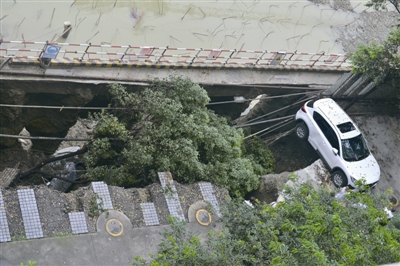 昨日凌晨,成都市城區普降大雨。早上7點,武侯區棕樹南街水漪裊銅小區停車場地面下陷,形成6米寬、10米長、4米深的深坑,停放的4輛小轎車跌入坍陷坑中,1輛小轎車懸空。塌方位置緊鄰一在建深基坑作業工地,且與小區樓房相距不足10米,居民十分擔心居住安全。