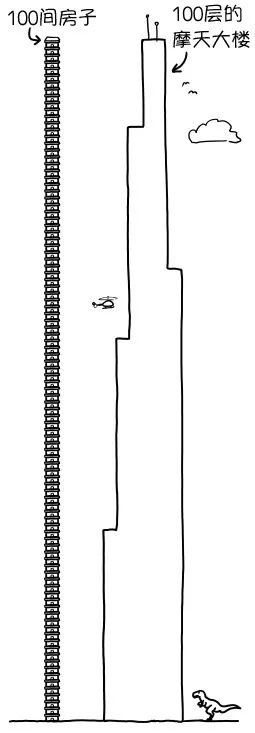 一座超級摩天大樓或許能有100層,說白了就是100套平房疊起來。