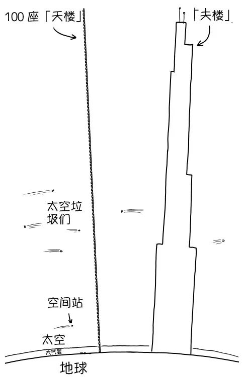 好,我們把100座這樣的「大樓」疊成個「天樓」,樓頂還差一半就能到外太空了。