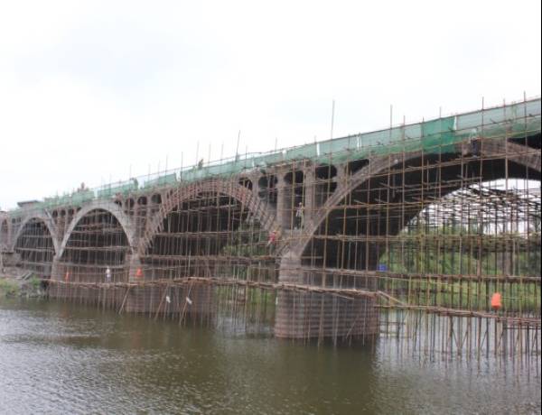 經過一個月緊張的橋梁加固施工,已完成腳手架搭設,主拱圈鋼筋1-4跨綁扎和腹拱圈和輔跨拱圈植筋和封縫灌漿,第一跨主拱圈側面和拱背混凝土也已澆筑完畢,完成總進度的30%。目前,正在加緊實施腹拱圈和輔跨拱圈混泥土灌漿工作。