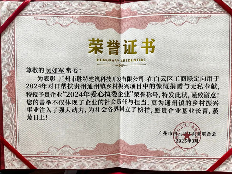 近日,廣州市勝特建筑科技開發有限公司收到一份特殊的榮譽——由廣州市白云區工商業聯合會頒發的 “2024年愛心執委企業” 榮譽證書。該證書是為表彰公司在2024年對口幫扶貴州通州鎮鄉村振興項目中,展現出的慷慨捐贈與無私奉獻精神。