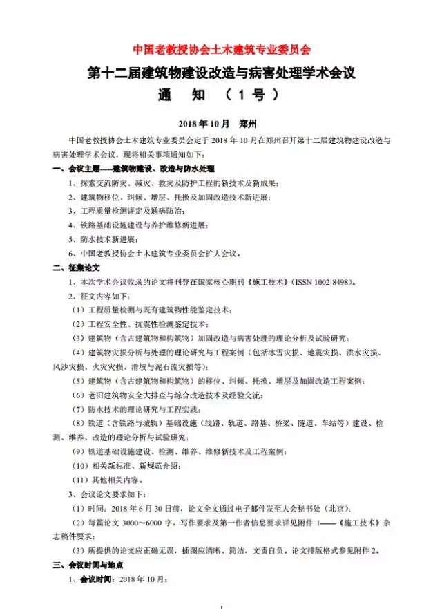 中國老教授協(xié)會土木建筑專業(yè)委員會 學(xué)術(shù)會議 2018 年 10 月 鄭州 會議介紹 中國老教授協(xié)會土木建筑專業(yè)委員會定于 2018 年 10 月在鄭州召開第十二屆建筑物建設(shè)改造與病害處理學(xué)術(shù)會議,現(xiàn)將相關(guān)事項(xiàng)通知如下: 現(xiàn)將相關(guān)事項(xiàng)通知如下: 一、會議主題—--建筑物建設(shè)、 改造與防水處理: 1、探索交流防災(zāi)、減災(zāi)、救災(zāi)及防護(hù)工程的新技術(shù)及新成果; 二、征集論文 1、 本次學(xué)術(shù)會議收錄的論文將刊登在國家核心期刊《施工技術(shù)》(ISSN 1002-8498)。 三、會議時間與地點(diǎn): 1、 會議時間: 2018 年 10 月; 四、會議資科。 會議向代表提供如下資料: 五、特別說明。 1、 論文版面費(fèi)初定每篇 500 元,每篇論文超過 8000 字者, 另行追加費(fèi)用; 六、會議主辦單位: 中國老教授協(xié)會土木建筑專業(yè)委員會, 北京交通大學(xué) 會議承辦單位: 鄭州賽諾建材有限公司 附件 1:《施工技術(shù)》雜志稿件要求