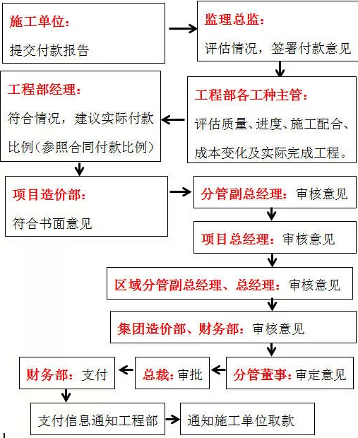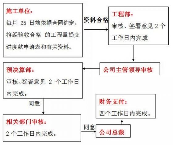 3、次月15日財務支付工程款。(原則上每月只辦理一次工程款審批,如果需要在月初或月末支付,需要項目部經辦工程師通過郵件向財務負責人、主管領導報告,獲審批同意后才可執行,并同時抄送給項目成本人員和成本部經理。)