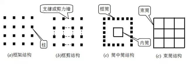 1】框架形成的筒體結構,內筒及其它豎向構件主要承受豎向荷載,外層框架主要承受側向荷載