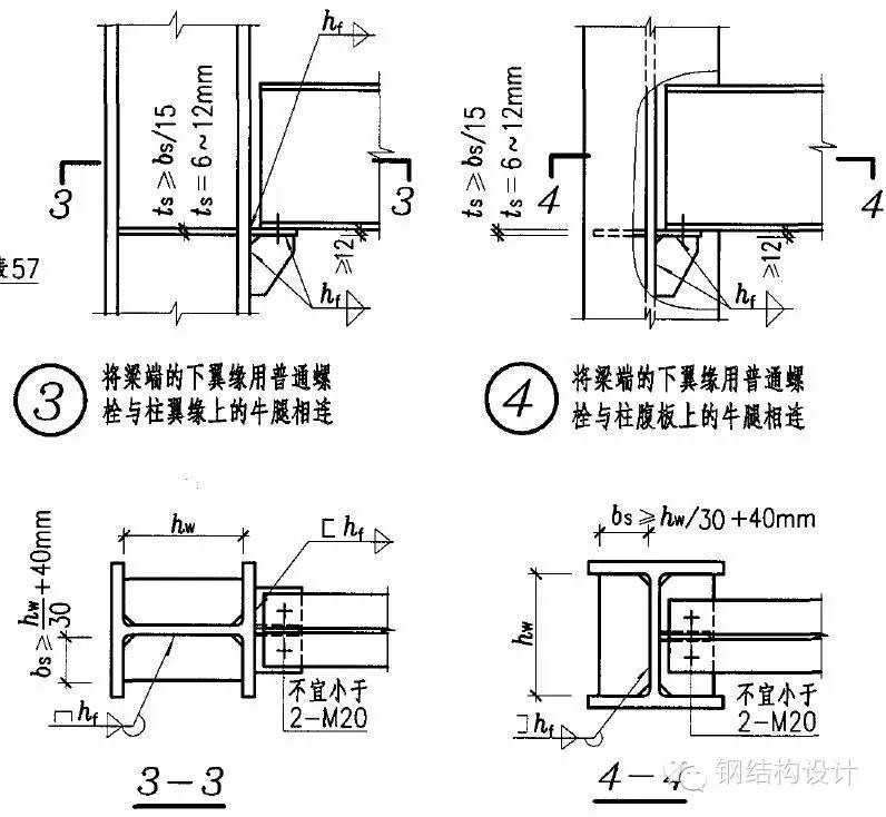 當次梁跨數較多,跨度、荷載較大時,次梁與主梁的連接宜設計為剛接,此時次梁可視作連續梁,這樣可以減少次梁的撓度,節約鋼材。次梁與主梁的剛接形式如下圖所示。