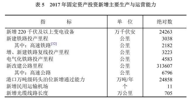 從固定資產(chǎn)投資新增主要生產(chǎn)能力看,2017年,我國新建鐵路投產(chǎn)里程3038公里。其中新增高速鐵路2182公里;增、新建鐵路復(fù)線投產(chǎn)3223公里;電氣化鐵路投產(chǎn)4583公里。2017年,我國新改建公路313607公里。其中高速公路里程數(shù)達(dá)到6796公里。我國建成了世界上最大的高速公路網(wǎng)和高鐵運(yùn)營網(wǎng)。